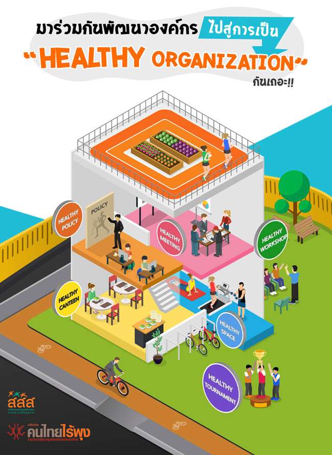 ดร.นพ.ไพโรจน์ เสาน่วม ผู้ช่วยผู้จัดการกองทุนสนับสนุนการสร้างเสริมสุขภาพ (สสส.) และรักษาการผู้อำนวยการสำนักสร้างเสริมวิถีชีวิตสุขภาวะ สสส. กล่าวว่า โครงการ “การสร้างเสริมสุขภาพประชาชนวัยทำงานในองค์กร ด้วยการวางระบบ Intervention & Tools เพื่อพัฒนาองค์กรไปสู่การเป็น Healthy Organization” มีวัตถุประสงค์ไม่เพียงแต่ให้ประชาชนวัยทำงานในองค์กรได้รับความรู้ในการปรับเปลี่ยนพฤติกรรมเพื่อให้มีสุขภาพดี ห่างไกลจากการเกิดโรคไม่ติดต่อเรื้อรัง แต่ยังครอบคลุมถึงการถ่ายทอดความรู้ สู่การปฏิบัติในชีวิตประจำวัน และอำนวยความสะดวกให้ผู้บริหาร และทีมงาน/คณะทำงานสร้างเสริมสุขภาพพนักงานขององค์กร สามารถนำตัวอย่าง, แนวทาง, สื่อความรู้ไปใช้ในการปรับเปลี่ยนสภาพแวดล้อมในองค์กร ให้เอื้ออำนวยต่อการสร้างเสริมสุขภาพของพนักงานในองค์กรได้ด้วย 6 องค์ประกอบหลัก ได้แก่ นโยบายสุขภาพ (Healthy Policy), การอบรมเชิงปฏิบัติการด้านการดูแลสุภาพ (Healthy Workshop), โรงอาหารสร้างเสริมสุขภาพ (Healthy Canteen), พื้นที่สร้างสุขภาวะ เอื้อต่อการเพิ่มกิจกรรมทางกาย (Healthy Space), การประชุมที่ดีต่อสุขภาพ (Healthy Meeting) และการแข่งขันสร้างเสริมสุขภาพ (Healthy Tournament) ซึ่งขณะนี้ขยายผลไปยังองค์กรต่างๆ ซึ่งมีมากกว่า 300 องค์กรที่เข้าร่วม
