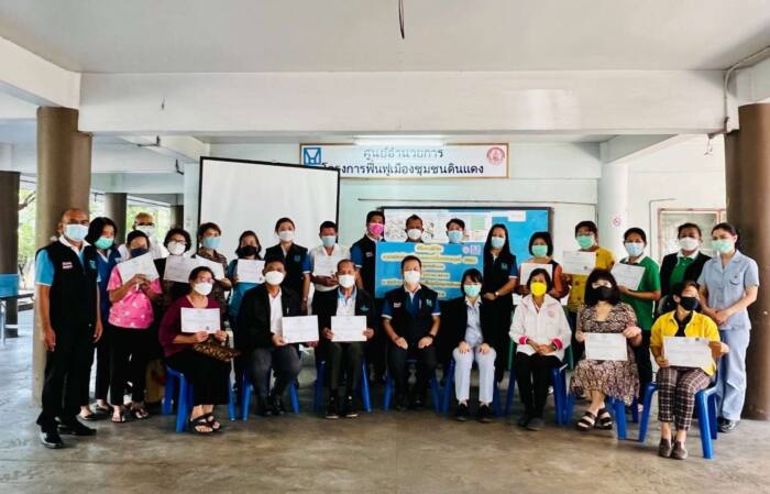 ทั้งนี้ ฝ่ายฟื้นฟูและพัฒนาเมือง 1 (ชุมชนดินแดง) ได้จัดโครงการอบรมเชิงปฏิบัติการอาสาสมัครพัฒนาสังคมและความมั่นคงของมนุษย์ (อพม.) เคหะชุมชนดินแดง ตามแผนปฏิบัติการ โดยมีเป้าหมายจัดกิจกรรมดำเนินงานด้านสังคมและการมีส่วนร่วม สร้างความรู้ ความเข้าใจ ความสัมพันธ์ที่ดี รวมทั้งการสร้างการมีส่วนร่วมให้กับผู้อยู่อาศัยในโครงการเคหะชุมชนดินแดง ตลอดจนบูรณาการร่วมกับหน่วยงานของรัฐและเอกชนในพื้นที่เพื่อพัฒนาคุณภาพชีวิตให้ดีขึ้น ทั้งด้านสังคม เศรษฐกิจ และสิ่งแวดล้อม จากการอบรมมีมติให้เลือกผู้ประสานงานร่วมกับ อพม. เขตดินแดง จำนวน 4 คน ได้แก่ นางบุญถึง อินทรทัต ประสานงานพื้นที่โครงการฟื้นฟูเมืองชุมชนดินแดง ระยะที่ 1 (แปลง G) นางประภา เชยประทุม ประสานงานพื้นที่เคหะชุมชนดินแดง 1 นางจุฑามาศ เกษแก้ว และ นางวัลนา บัวยังตูม ประสานงานพื้นที่เคหะชุมชนดินแดง 2 เพื่อแจ้งข้อมูลข่าวสาร การให้ความช่วยเหลือประชาชนทุกกลุ่มเป้าหมายที่ประสบปัญหาทางสังคม และเข้ามาเป็นส่วนหนึ่งของงานจิตอาสาช่วยเหลือสังคม พร้อมทั้งส่งเสริมและสนับสนุนการดำเนินงานของอาสาสมัครพัฒนาสังคมและความมั่นคงของมนุษย์ (อพม.) เคหะชุมชนดินแดง อีกทั้งร่วมกันสืบสาน รักษา ต่อยอด และสร้างสุขให้กับชุมชนดินแดง