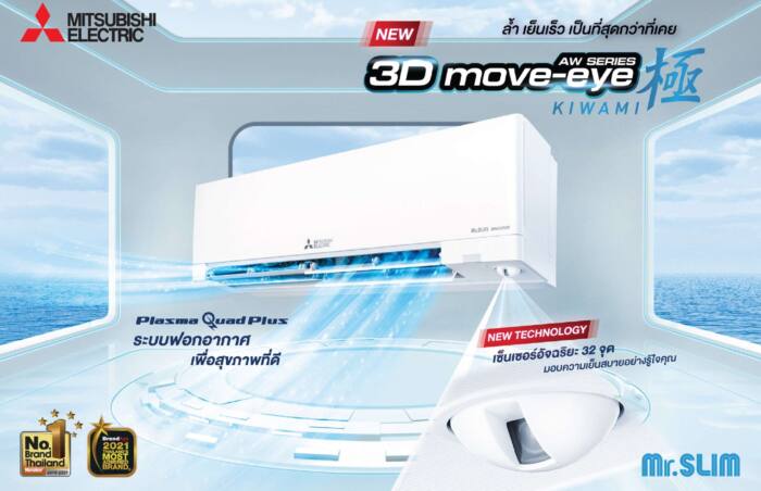 – เครื่องปรับอากาศมิตซูบิชิ อีเล็คทริค มิสเตอร์สลิม 3D Move-eye Kiwami AW Series โดดเด่นด้วยเซ็นเซอร์อัจฉริยะ 3D Move-eye Kiwami มากถึง 32 จุด ตรวจจับอุณหภูมิและความเคลื่อนไหวของผู้คนได้อย่างละเอียดแม่นยำ ผสานการทำงานร่วมกับ Fast Cooling A.I. ช่วยให้เย็นเร็วยิ่งขึ้น ด้วยการปรับอุณหภูมิอัตโนมัติพร้อมควบคุมทิศทางการกระจายความเย็นได้ 3 รูปแบบ ตามความเหมาะสมกับอุณหภูมิห้องและผู้ใช้งาน สัมผัสความเย็นสบายที่มาพร้อมการประหยัดพลังงาน และมั่นใจในคุณภาพอากาศด้วย Plasma Quad Plus ระบบฟอกอากาศที่ช่วยดักจับและยับยั้งสิ่งเจือปนในอากาศขนาดเล็ก เช่น เชื้อรา ฝุ่นละอองขนาดเล็ก PM 2.5 และสามารถยับยั้งเชื้อไวรัส ได้ถึง 8%