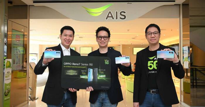 15 กุมภาพันธ์ 2565 – OPPO ผนึกกำลังกับ เอไอเอส นำโดย คุณทวีเกียรติ ธัญญวัฒนกุล หัวหน้าแผนกงานบริหารธุรกิจอุปกรณ์สื่อสาร (คนที่ 2 จากซ้าย) และ คุณทิฐินันท์ โชตินันทน์ หัวหน้าแผนกงานการตลาดด้านผลิตภัณฑ์ บริษัท แอดวานซ์ อินโฟร์ เซอร์วิส จำกัด (มหาชน) หรือ AIS (คนที่ 1 จากขวา) จับมือผนึกกำลังกับพันธมิตร คุณชานนท์ จิรายุกุล ประธานกรรมการอาวุโสฝ่ายบริหาร ออปโป้แห่งประเทศไทย (คนที่ 1 จากซ้าย) เปิดจอง OPPO Reno7 Series 5G สมาร์ทโฟน 5G ที่ถ่ายวิดีโอพอร์ตเทรตได้ดีที่สุด ในราคาสุดคุ้มเริ่มต้นเพียง 6,990 บาท พร้อมข้อเสนอสุดพิเศษมากมาย เมื่อจองผ่านเอไอเอส ตั้งแต่วันนี้ – 18 กุมภาพันธ์นี้