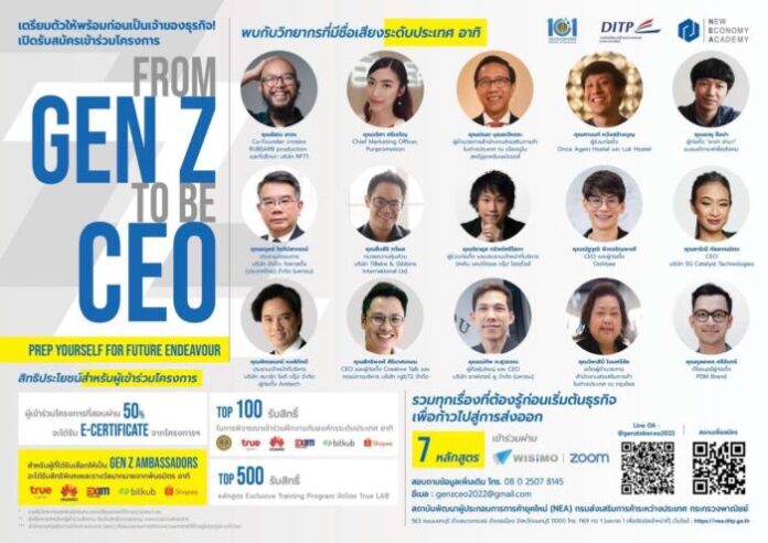 17 กุมภาพันธ์ 2565 – ตามนโยบายของนายจุรินทร์ ลักษณวิศิษฏ์ รองนายกรัฐมนตรีและรัฐมนตรีว่าการกระทรวงพาณิชย์ มอบหมายให้กรมส่งเสริมการค้าระหว่างประเทศ โดยสถาบันพัฒนาผู้ประกอบการการค้ายุคใหม่ หรือสถาบัน NEA (New Economy Academy) เดินหน้าจัดโครงการกระจายความรู้สู่ผู้ประกอบการยุคใหม่ (From Gen Z to be CEO) ประจำปี 2565 เพื่อเพิ่มพูนองค์ความรู้ด้านการค้าระหว่างประเทศให้กับน้องๆ Gen Z ซึ่งเป็นความหวังในการขับเคลื่อนเศรษฐกิจ โดยเร่งจัดโครงการ From Gen Z to be CEO ในรูปแบบออนไลน์ และขอเชิญชวนผู้ที่สนใจเข้าร่วมอบรมเพื่อก้าวสู่การเป็นผู้ประกอบการรุ่นใหม่ที่จะเป็นแม่ทัพทางเศรษฐกิจของประเทศชาติต่อไป