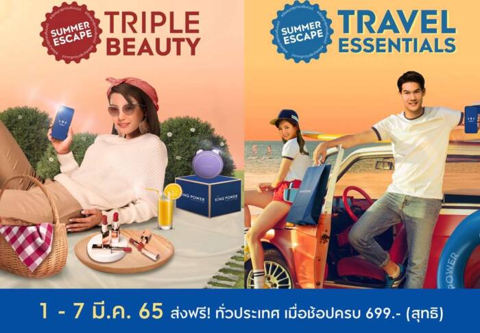 28 กุมภาพันธ์ 2565 – www.kingpower.com และ คิง เพาเวอร์ แอปพลิเคชัน จัดแคมเปญ SUMMER ESCAPE เอาใจนักช้อปออนไลน์มอบ 2 ดีลราคาสุดพิเศษ TRIPLE BEAUTY และ TRAVEL ESSENTIALS ด้วยสินค้าคุณภาพ ราคาดิวตี้ฟรี พร้อมบริการ Home Delivery ส่งฟรีไม่มีขั้นต่ำ ระหว่างวันที่ 1-7 มีนาคม 65 นี้