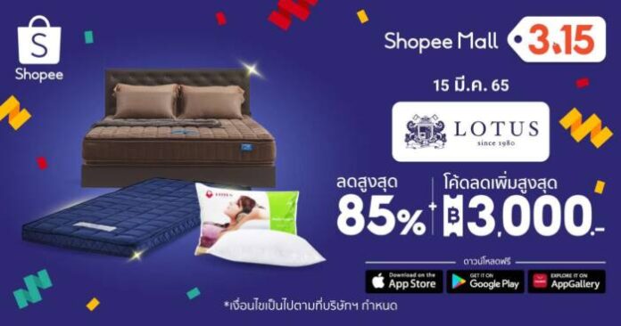 โลตัส แมทเทรส (Lotus Mattress) ผู้ผลิตที่นอนและเครื่องนอนชั้นนำของโลก ผนึกกำลังกับ ช้อปปี้ (Shopee) ผู้นำแพลตฟอร์มอีคอมเมิร์ซในภูมิภาคเอเชียตะวันออกเฉียงใต้และไต้หวัน จัดใหญ่เอาใจผู้บริโภคให้นอนหลับสบายยิ่งกว่าเดิม พร้อมความคุ้มค่าแบบจัดเต็ม ยกทัพสินค้าในกลุ่มที่นอนและเครื่องนอนกว่า 1,380 รายการ พร้อมกับดีลเด็ด โปรโมชั่นส่วนลดสูงสุดกว่า 85 % และสิทธิประโยชน์อีกมากมาย รวมมูลค่าสูงสุด 10 ล้านบาทตลอดทั้งแคมเปญ เพื่อเป็นการร่วมเฉลิมฉลองมหกรรมช้อปปิ้งออนไลน์สุดยิ่งใหญ่ครั้งแรกของปี Shopee 3.15 Consumer Day ตั้งแต่วันที่ 4 ถึง 15 มีนาคม 2565