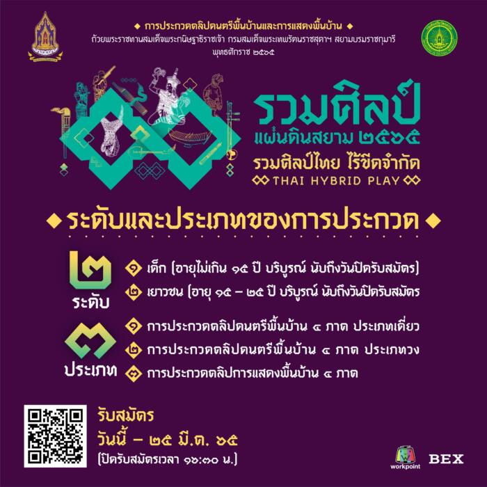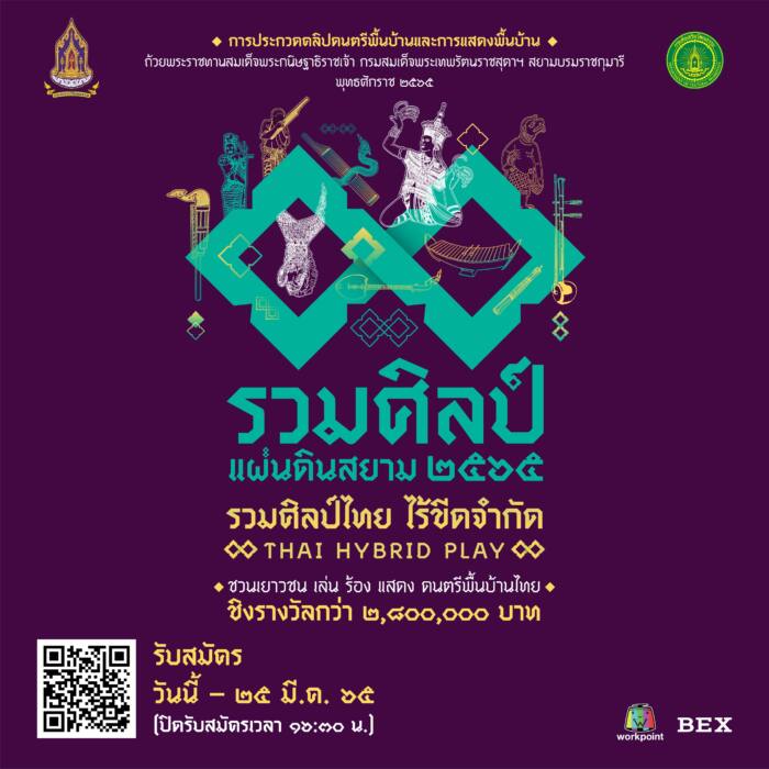 ในปี 2565 นี้ กรมส่งเสริมวัฒนธรรม กระทรวงวัฒนธรรม ได้กำหนดจัดการประกวดคลิปดนตรีและคลิปการแสดงพื้นบ้าน 4 ภาค “รวมศิลป์ แผ่นดินสยาม” ปีที่ 16 เทิดพระเกียรติสมเด็จพระกนิษฐาธิราชเจ้า กรมสมเด็จพระเทพรัตนราชสุดาฯ สยามบรมราชกุมารี เนื่องในโอกาสวันคล้ายวันพระราชสมภพ 2 เมษายน 2565 เพื่อเผยแพร่พระมหากรุณาธิคุณ ที่ทรงพลิกฟื้นศิลปะการแสดงพื้นบ้านด้วยพระบารมี นำมาสู่การอนุรักษ์อย่างต่อเนื่อง ผู้เข้าร่วมประกวดจะได้รับรางวัลถ้วยพระราชทาน สมเด็จพระกนิษฐาธิราชเจ้า กรมสมเด็จพระเทพรัตนราชสุดาฯ สยามบรมราชกุมารี และเงินรางวัลรวมกว่า 2,800,000 บาท