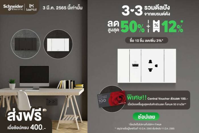 ชไนเดอร์ อิเล็คทริค จัดเต็มแคมเปญดีลสุดระทึก 3.3 ลดจัดหนักลดสูงสุด 50 เปอร์เซ็นต์ ใน Lazada และ Shopee และคูปองส่วนลดอีกสูงสุด 12 เปอร์เซ็นต์ ยังไม่พอ เมื่อซื้อสินค้าสวิตช์ – เต้ารับ AvatarOn A ครบ 10 ชิ้น รับส่วนลดเพิ่มอีก 3% พร้อมลุ้นรับ Gift Voucher จาก Central 100 บาท พร้อมข้อเสนอพิเศษส่งฟรี!!! เมื่อช้อปครบ 400 บาท โดยงานนี้ชไนเดอร์ อิเล็คทริค ยกทัพผลิตภัณฑ์มาจัดโปรฯ ถึง 3 กลุ่มด้วยกัน