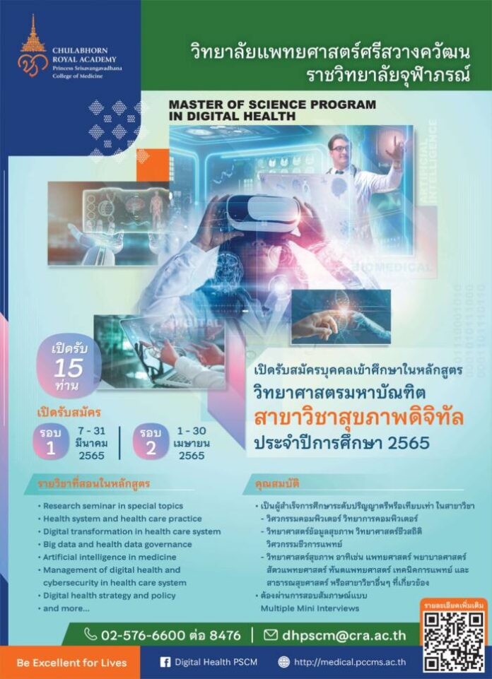 รับสมัครบุคคลเข้าศึกษาต่อ “หลักสูตรวิทยาศาสตรมหาบัณฑิต สาขาวิชาสุขภาพดิจิทัล” วิทยาลัยแพทยศาสตร์ศรีสวางควัฒน ราชวิทยาลัยจุฬาภรณ์ ประจำปีการศึกษา ๒๕๖๕