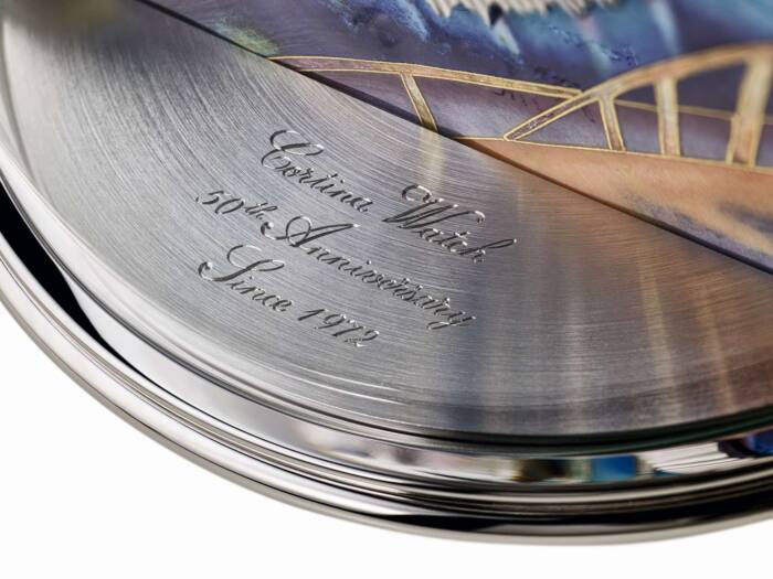 กิโยเช่ ประดิษฐ์ในรูปแบบหยักเข้าออกเพื่อให้เป็นรูปร่างคล้ายดอกไม้ในสวน โดยจัดเข็มบอกเวลาแบบแนวตรง 12 แท่ง ซึ่งทำมาจาก หิน Lapis Lazuli 2.27 กะรัต โดยวางล้อมหน้าปัดกลางที่ลงยาแบบ cloisonné enamel และมีการแกะสลักชื่อ “Cortina Watch – 50th Anniversary – Since 1972” นาฬิกาโดมนี้ใช้ Caliber 17 นิ้ว แบบ PEND Mechanical Movement โดยสามารถไขลานโดยใช้มอเตอร์ไฟฟ้า