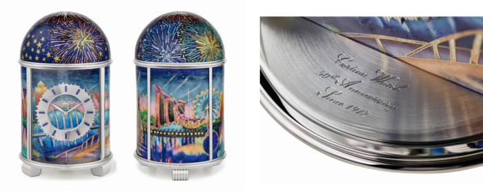 ในการประดิษฐ์รูปร่างขอบฟ้าและรูปอนุสาวรีย์ต่าง ๆ นั้น ช่างเคลือบใข้ ทองคำ 24k ถึง 9.2 เมตร ในการผลิต โดยมีสัดส่วน 0.2 x 0.6 มม. โดยได้ตัดให้เป็นชิ้นส่วนเล็ก ๆ และประดิษฐ์ขึ้นด้วยมือทั้งสิ้น ในการประดิษฐ์รูปภาพด้านหลังมีการจัดแต้มสีต่าง ๆ โดยใช้วิธีการที่ละเอียดอ่อนที่สุดโดยลงสีเป็นชั้น ๆ ขั้นตอนการลงยา ใช้กว่า 50 สีในการผลิตครั้งนี้ มี 47 สีเป็นสีแบบใส และมี 1 สีแบบทึบแสง และอีก 2 สีที่เป็นสีเหลือบ ในการลงยาแต่ละชิ้น จะต้องมีการเผาประมาณ 10-14 ครั้งที่อุณหภูมิสูงระหว่าง 890 ถึง 910 องศาเซลเซียส ในส่วนของดาวและแสงพลุนั้น ได้ประดิษฐ์ไว้ในรูปแบบกระจายตัวของดาวห้าสิบดวงและแสงประกายของพลุไฟ สิ่งเหล่านี้ทำมาจากทองคำและเงินอย่างสวยงาม โดยทำให้เป็นในรูปแบบกระจายทั่วท้องฟ้า เพื่อเป็นสัญลักษณ์การเฉลิมฉลอง 50 ปี ในส่วนของหน้าปัดบอกเวลานั้น ใช้การสลักแบบ