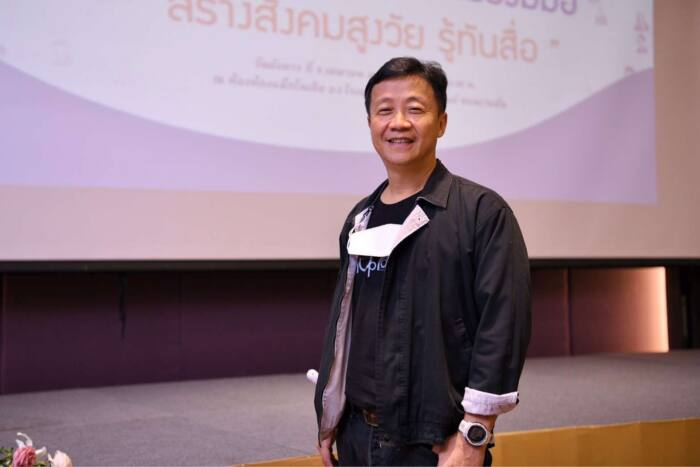 นายวันชัย บุญประชา ที่ปรึกษากลุ่มคนตัวD บริษัท ทำมาปัน จำกัด กล่าวว่า กลุ่มคนตัวD ร่วมกับ สสส. และภาคีเครือข่าย ขับเคลื่อนงานสร้างพลเมืองเท่าทันสื่อ ตั้งแต่ปี 2562 มีบทบาทในการออกแบบกระบวนการการจัดการความรู้ ซึ่งในปี 2565 ได้พัฒนาเครื่องมือ “คาถาสูงวัย รู้ทันสื่อ” 3 ข้อ 1. จำเป็นหรือไม่? 2. หาข้อมูลเพิ่มเติม และ 3. เดือดร้อนตัวเองและคนรอบข้างหรือไม่? เพื่อให้ผู้สูงอายุเป็นผู้ที่สามารถวิเคราะห์สื่อ รับสื่อ และใช้สื่ออย่างปลอดภัย ตอบโจทย์บริบทการใช้สื่อในแต่ละพื้นที่ ทั้งสื่อออนไลน์ สื่อโทรทัศน์ และสื่อบุคคล ถือเป็นการป้องกันการแพร่กระจายของข่าวลวงและเตรียมความพร้อมสู่สังคมสูงอายุโดยสมบูรณ์