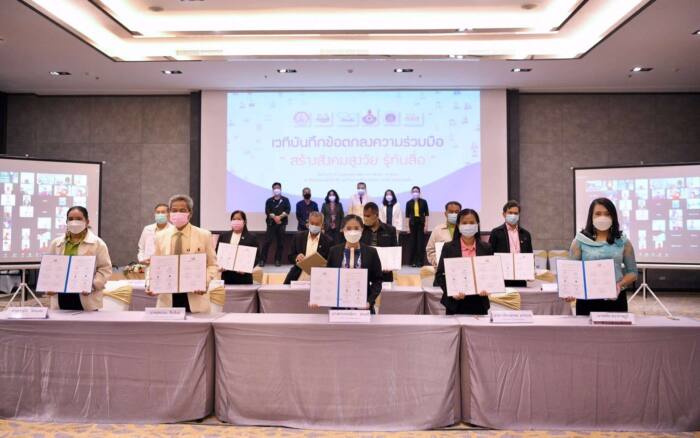 เมื่อวันที่ 5 เมษายน 2565 ที่โรงแรมทีเค พาเลซ แอนด์ คอนเวนชั่น กรุงเทพฯ สำนักงานกองทุนสนับสนุนการสร้างเสริมสุขภาพ (สสส.) ร่วมกับ กรมกิจการผู้สูงอายุ กระทรวงการพัฒนาสังคมและความมั่นคงของมนุษย์ (พม.) สมาคมสภาผู้สูงอายุแห่งประเทศไทย ในพระราชูปถัมภ์สมเด็จพระศรีนครินทราบรมราชชนนี สถาบันวิจัยภาษาและวัฒนธรรมเอเชีย มหาวิทยาลัยมหิดล บริษัท ทำมาปัน จำกัด และภาคีเครือข่ายสูงวัยรู้ทันสื่อ 12 จังหวัด ร่วมจัดพิธีลงนามบันทึกข้อตกลงความร่วมมือ “สร้างสังคมสูงวัย รู้ทันสื่อ” เพื่อขับเคลื่อนการทำงานสร้างสังคมสูงวัยรู้ทันสื่อให้ครอบคลุมทั่วประเทศ นำไปสู่การสร้างเสริมวิถีชีวิตสุขภาวะยั่งยืน