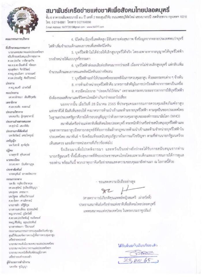 วันที่ 1 พฤษภาคม ศ.เกียรติคุณ พญ.สมศรี เผ่าสวัสดิ์ ประธานสมาพันธ์เครือข่ายแห่งชาติเพื่อสังคมไทยปลอดบุหรี่ กล่าวว่า เมื่อวันที่ 26 เมษายน ที่ผ่านมา สมาพันธ์เครือข่ายแห่งชาติเพื่อสังคมไทยปลอดบุหรี่ ได้ยื่นจดหมายเปิดผนึกถึงนายกรัฐมนตรี และคณะรัฐมนตรีทุกท่าน เพื่อให้ข้อมูลสนับสนุนการห้ามนำเข้าและจำหน่ายบุหรี่ไฟฟ้าในประเทศไทย โดยมีใจความสำคัญคือ ขณะนี้มีบทเรียนจากหลายประเทศที่ไม่ห้ามขายบุหรี่ไฟฟ้า ต้องประสบปัญหาอัตราการสูบบุหรี่ไฟฟ้าในกลุ่มเด็กและเยาวชนเพิ่มสูงขึ้นอย่างน่าเป็นห่วง จนเป็นสาเหตุให้ประเทศต่าง ๆ ออกกฎหมายห้ามนำเข้าและจำหน่ายบุหรี่ไฟฟ้าเพิ่มมากขึ้นเรื่อย ๆ ซึ่งปัจจุบันตามรายงานขององค์การอนามัยโลกมีประเทศที่ห้ามบุหรี่ไฟฟ้าแล้วจำนวน 32 ประเทศ