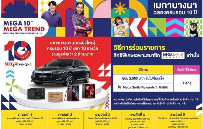 ศูนย์การค้าเมกาบางนา ศูนย์การค้าที่จะทำให้ทุก ๆ วัน เป็นวันพิเศษสำหรับคนพิเศษเช่นคุณ เฉลิมฉลองครบรอบ 10 ปีของเมกาบางนา จัดแคมเปญสุดยิ่งใหญ่ “Megabangna The 10th Anniversary” เพื่อแทนคำขอบคุณลูกค้าที่สนับสนุนเมกาบางนามาตลอด โดยตลอดเดือนพฤษภาคม –  กรกฎาคม 2565 สมาชิกเมกา สไมล์ รีวอร์ดส ช็อปครบ 2,500 บาทขึ้นไป/ใบเสร็จ หรือใช้คะแนนเมกา สไมล์ รีวอร์ดส 3 คะแนน แลกรับสิทธิ์ 1 สิทธิ์ เพื่อลุ้นรับรางวัลใหญ่ รถยนต์ Honda Accord 1.5 TURBO EL มูลค่า 1,499,000 ล้านบาท และรางวัลพิเศษอื่น ๆ อาทิ กล้อง Leica Q2, บัตรกำนัลแทนเงินสดจากอิเกีย, Samsung Galaxy S22 Ultra 256 GB และ IPAD Pro 11 inch 512 GB รวม 10 รางวัล มูลค่าทั้งหมดกว่า 2 ล้านบาท