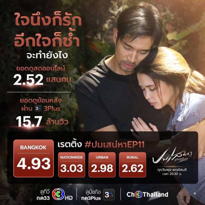 โกยความปังกันไปเลยจ้า สำหรับ “ปมเสน่หา” ทางช่อง 3 ผลงานของผู้จัดคนเก่ง “เมย์ ปทิดา กำเนิดพลอย” ที่ทำเรตติ้งปังไม่ไหว เรียกว่ามากระแสร้อนแรงที่สุดในเวลานี้เลยก็ว่าได้ ในฝีมือการแสดงของ ไอ้ต้าวพายุ(เกรท วรินทร ปัญหกาญจน์) และ ปาริฉัตร(แพทริเซีย ธัญชนก กู๊ด) ที่ตามง้องอนกันถึงในป่าในดงแบ่งรับแบ่งสู้ทำคนดูเชียร์หนัก จนคว้าเรตติ้งของ ep.11 ในพื้นที่กรุงเทพฯ ไปได้อย่างสวยงามถึง 4.93