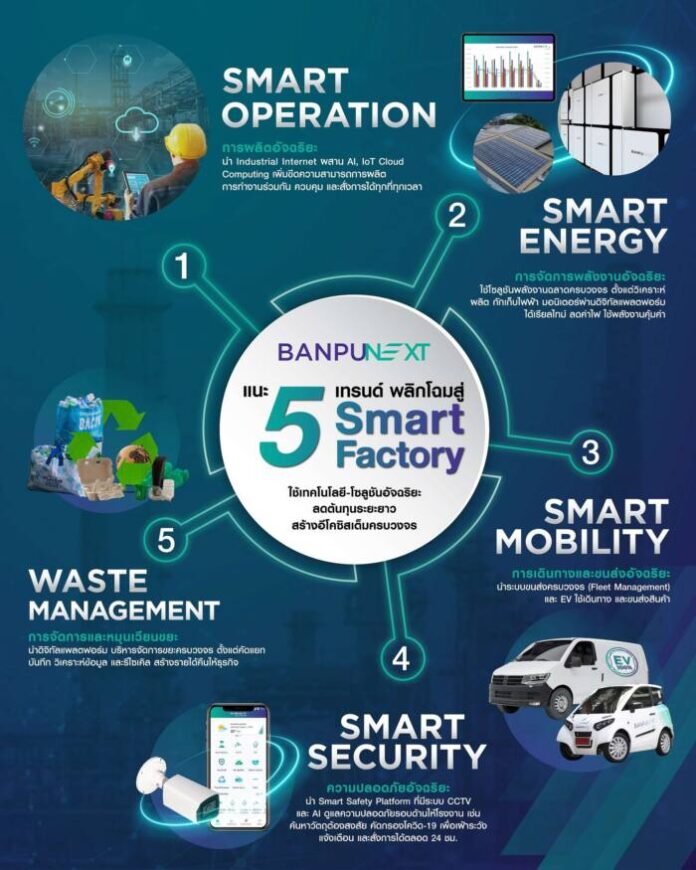บ้านปู เน็กซ์ แนะ 5 เทรนด์การใช้เทคโนโลยี-โซลูชันอัจฉริยะที่ผู้ประกอบการภาคธุรกิจและอุตสาหกรรมยุคใหม่ต้องมี และควรนำไปประยุกต์ใช้ในการดำเนินงานตั้งแต่ต้นน้ำถึงปลายน้ำ เพื่อยกระดับและเพิ่มขีดความสามารถทางการแข่งขัน ลดต้นทุนในระยะยาว สร้างการเติบโตที่ยั่งยืน พร้อมทรานส์ฟอร์มธุรกิจให้สมาร์ท ก้าวสู่นิคมอุตสาหกรรมเชิงนิเวศ 4.0 (Smart Eco 4.0) และโรงงานอัจฉริยะ (Smart Factory) พาธุรกิจพร้อมรับมือได้ทุกสถานการณ์