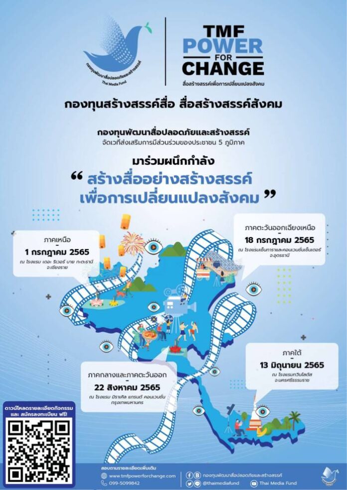 กองทุนพัฒนาสื่อปลอดภัยและสร้างสรรค์ (Thai Media Fund : TMF) เชิญชวนผู้สนใจเข้าร่วมกิจกรรม โครงการจัดเวทีส่งเสริมการมีส่วนร่วมของประชาชน 5 ภูมิภาค ประจำปี 2565 ภายใต้แนวคิด “TMF POWER FOR CHANGE : สื่อสร้างสรรค์เพื่อการเปลี่ยนแปลงสังคม”โดยมีวัตถุประสงค์เพื่อเผยแพร่ความรู้และแนวคิดด้านสื่อปลอดภัยและสร้างสรรค์ การรู้เท่าทันสื่อสารสนเทศและดิจิทัล การประชาสัมพันธ์ภารกิจและการสนับสนุนทุนของกองทุนพัฒนาสื่อปลอดภัยและสร้างสรรค์ รวมทั้งรับฟังความคิดเห็นจากภาคีเครือข่าย หน่วยงาน องค์กรภาครัฐ องค์กรวิชาชีพ ภาควิชาการ ภาคประชาสังคม และประชาชนทั่วไปในระดับภูมิภาค และต่อยอดให้เกิดการมีส่วนร่วมในการผลิตสื่อท้องถิ่นที่พัฒนาเป็นสื่อที่ปลอดภัยและสร้างสรรค์ พร้อมนำร่องจัด “เวทีส่งเสริมการมีส่วนร่วมของประชาชน ครั้งที่ 1 ภาคใต้” โดยได้รับเกียรติจาก นางยุพา ทวีวัฒนะกิจบวร ปลัดกระทรวงวัฒนธรรม เป็นประธานเปิดงาน พร้อมด้วย ดร.ธนกร ศรีสุขใส ผู้จัดการกองทุนพัฒนาสื่อปลอดภัยและสร้างสรรค์ ในวันจันทร์ที่ 13 มิถุนายน 2565 เวลา 9.00-16.00 น. ณ โรงแรมทวินโลตัส จังหวัดนครศรีธรรมราช