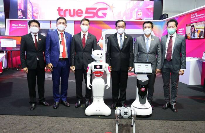 พลเอก ประยุทธ์ จันทร์โอชา นายกรัฐมนตรี และนายชัยวุฒิ ธนาคมานุสรณ์ รัฐมนตรีว่าการกระทรวงดิจิทัลเพื่อเศรษฐกิจและสังคม (ดีอีเอส) เยี่ยมชมนวัตกรรมโซลูชัน 5G ในบูธทรู นำเสนอศักยภาพระบบนิเวศทรู 5G นวัตกรรมและโซลูชัน รวมทั้ง Use Case ที่หลากหลายครอบคลุมทุกมิติของทุกอุตสาหกรรม เสริมแกร่งองค์กรธุรกิจไทย เพิ่มศักยภาพการแข่งขันให้ก้าวนำคู่แข่งไปอีกขั้น และเป็นพลังร่วมขับเคลื่อนเศรษฐกิจและสังคมไทยให้เติบโตได้อย่างยั่งยืน โดยมี นายณัฐวุฒิ อมรวิวัฒน์ (ที่ 3 จากซ้าย) กรรมการผู้จัดการใหญ่ (ร่วม) บมจ. ทรู คอร์ปอเรชั่น พร้อมคณะผู้บริหารให้การต้อนรับ ในงาน Thailand 5G Summit : The 5G Leader in the Region ณ โรงแรมเซ็นทารา แกรนด์ และ บางกอก คอนเวนชัน เซ็นเตอร์ เซ็นทรัลเวิลด์