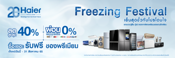 เพื่อตอบแทนผู้บริโภคในโอกาสครบรอบ 20 ปีไฮเออร์ (Haier) ผู้นำด้านผลิตภัณฑ์และนวัตกรรมเครื่องใช้ไฟฟ้าระดับโลกและเป็นแบรนด์เครื่องใช้ไฟฟ้าภายในบ้านยอดขายอันดับ 1 ของโลกติดต่อกัน 13 ปีซ้อน ผนึกกำลังกับดีลเลอร์ทั่วประเทศ ส่งแคมเปญ “ฟรีซซิ่ง เฟสติวัล เย็นสุดขั้วกับโปรโดนใจ” ยกขบวนสินค้าตู้เย็น ตู้แช่ และเครื่องใช้ไฟฟ้าอื่นๆ อีกมากมายในราคาลดพิเศษ พร้อมสมนาคุณของพรีเมียมอีกเพียบ ตั้งแต่วันนี้ถึง 31 สิงหาคม 2565