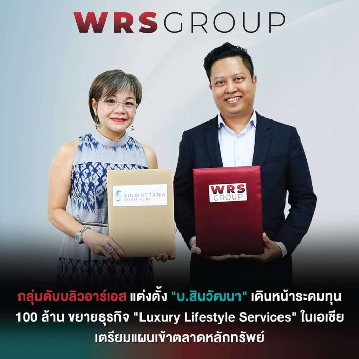 วันนี้ (18 ก.ค. 65) นายจักรพันธ์ รัตนเพชร ประธานเจ้าหน้าที่บริหาร กลุ่มดับบลิวอาร์เอส (WRS Group) แถลงข่าวการลงนามบันทึกความเข้าใจ (MOU) ร่วมกับ นางสาวฮอง ซิน เควก ประธานเจ้าหน้าที่บริหารและผู้ก่อตั้ง สินวัฒนา คราวด์ฟันดิง ที่อยู่ภายใต้การกํากับดูแลของ ก.ล.ต. เพื่อร่วมเป็นหนึ่งในการช่วยระดมทุน 3 ล้านเหรียญดอลลาร์สหรัฐ (ประมาณ 100 ล้านบาท) รองรับแผนขยายธุรกิจทั่วเอเชีย และเตรียมเข้าจดทะเบียนในตลาดหลัก ทรัพย์แห่งประเทศไทยภายในปี 2568 โดยมีพันธมิตรธุรกิจและสื่อมวลชนร่วมเป็นสักขีพยาน ณ สำนักงานใหญ่สินวัฒนา คราวด์ฟันดิง อาคารไอทีเอฟ ทาวเวอร์ สีลม กรุงเทพฯ
