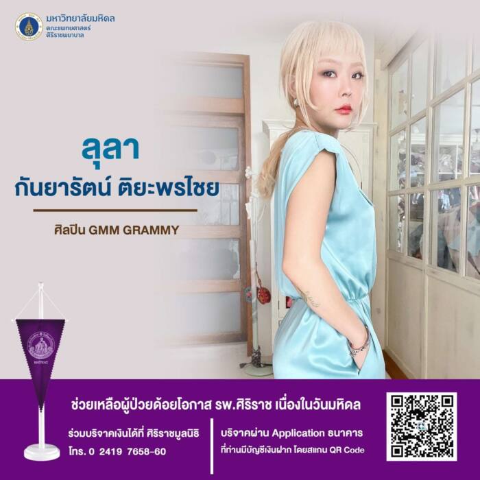 “เนื่องในวันมหิดล 24 กันยายนนี้ ลุลาอยากเชิญชวนทุกคนส่งต่อการให้เพื่อผู้ป่วยที่ยังรอความช่วยเหลือ สามารถบริจาคเงินเพื่อช่วยเหลือผู้ป่วยด้อยโอกาส โรงพยาบาลศิริราช เพื่อให้ผู้ป่วยเหล่านั้นได้รับโอกาส ในการรักษามากขึ้นค่ะ มาร่วมบริจาคกันเยอะๆ นะคะ”