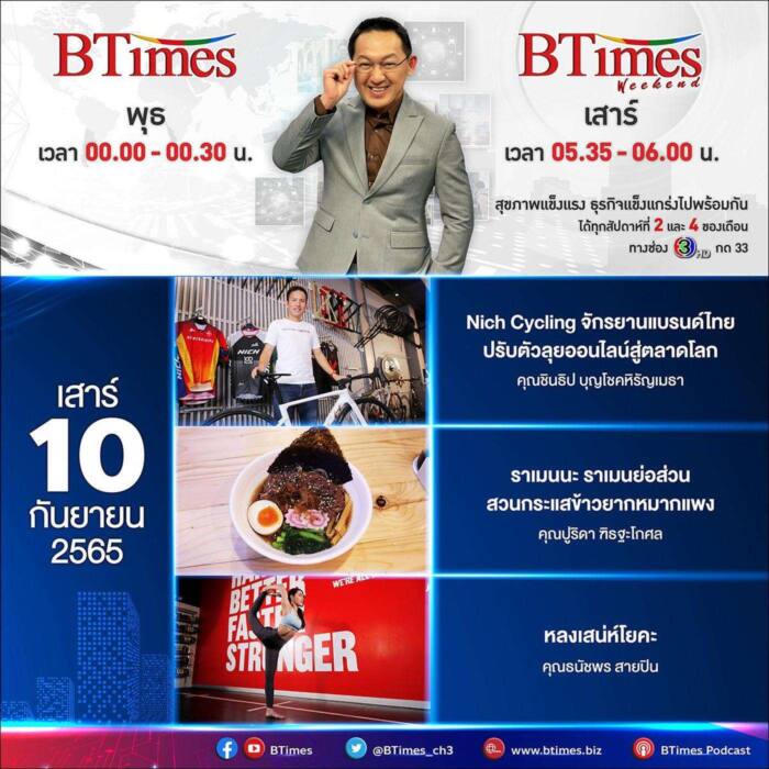 รายการ “BTimes Weekend” ช่วง “BTimes Talk” พบกับ Nich Cycling จักรยานแบรนด์ไทย High Performance ปรับตัวลุยออนไลน์สู่ตลาดโลก ต่อด้วยช่วง “Showbiz” พบกับ ราเมนนะ ชามละ 25 บาท ธุรกิจในกระแสวันนี้ จะพาไปดูธุรกิจที่เจ้าของมีแนวคิดทำราเมนสไตล์ญี่ปุ่น ให้เข้าถึงลูกค้าได้ง่าย ๆ แบบก๋วยเตี๋ยวเรือ จะเป็นอย่างไรไปชมกันครับ ปิดท้ายด้วยช่วง “Young @Heart Show” หญิงสาวที่ใช้โยคะในการออกกำลังกาย จนโยคะได้กลายเป็นส่วนหนึ่งของชีวิตที่ขาดไม่ได้ อะไรที่ทำให้เธอหลงใหลในการเล่นโยคะมาหาคำตอบได้กับ หลงเสน่ห์โยคะ กับ คุณอุ๋มอิ๋ม ธนัชพร สายปิน ติดตามทั้งหมดนี้ได้ในรายการ “BTimes Weekend” เวลา 05.35 – 06.00 น.