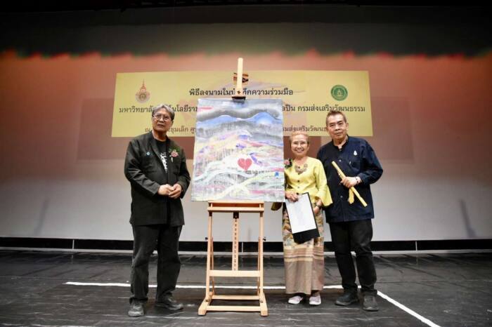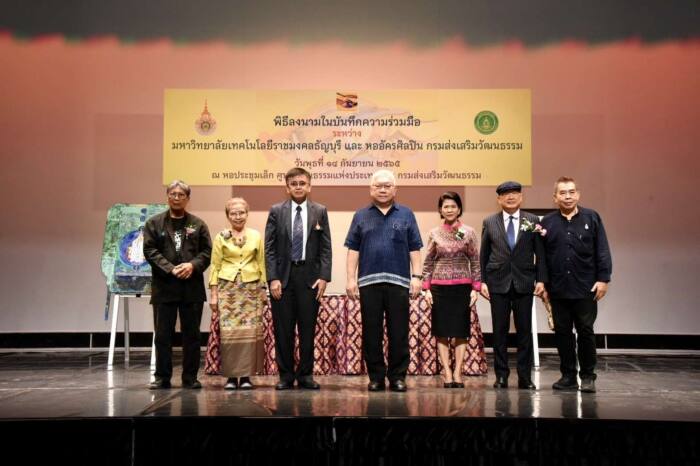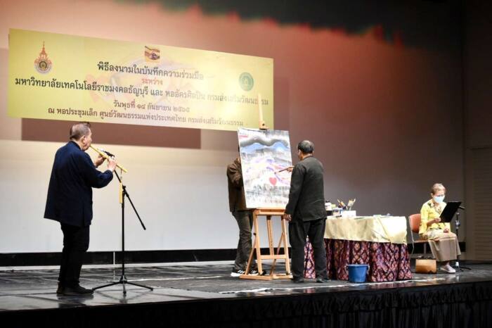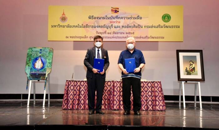 นายชาย นครชัย อธิบดีกรมส่งเสริมวัฒนธรรม และ นายวิรัช โหตระไวศยะ รองอธิการบดีมหาวิทยาลัยเทคโนโลยีราชมงคลธัญบุรี ร่วมลงนามความร่วมมือทางวิชาการ เพื่อพัฒนานวัตกรรมการจัดการเรียนรู้ ด้านศิลปวัฒนธรรม ได้รับเกียรติจากศิลปินแห่งชาติ ใน 3 สาขา ได้แก่ นายกมล ทัศนาญชล นางชมัยภร บางคมบาง และ นายธนิสร์ ศรีกลิ่นดี ร่วมเป็นสักขีพยานและแสดงงานศิลปะในช่วง “ศิลป์ กวี คีตา” เมื่อวันที่ 14 กันยายน 2565 เวลา 10.30 น. ณ หอประชุมเล็ก กรมส่งเสริมวัฒนธรรม