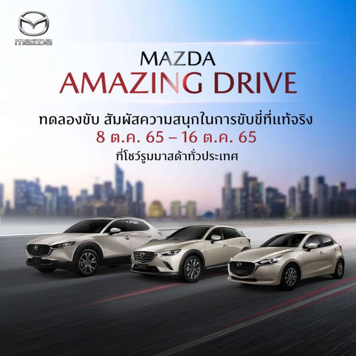 พร้อมกันนี้ในเดือนตุลาคม มาสด้ายังได้มอบข้อเสนอสุดพิเศษให้กับลูกค้าที่ต้องการออกรถใหม่ด้วยกิจกรรมสุดพิเศษ Mazda Amazing Drive ทดลองขับสัมผัสความสนุกในการขับขี่ที่แท้จริง ระหว่างวันที่ 8 – 16 ตุลาคม 2565 ที่โชว์รูมมาสด้าทั่วประเทศ ทดลองขับรถยนต์มาสด้าทุกรุ่น รับฟรี Starbucks Card มูลค่า 200 บาท* และเมื่อออกรถ รับฟรี Mazda Ultimate Service (MUS) หรือ โปรแกรมคุ้มครองและดูแลรถ 5 ปี* ฟรีประกันภัยชั้นหนึ่ง Mazda Premium Insurance (MPI) 1 ปี* และลำโพง Sony Portable Wireless Speaker มูลค่า 1,990 บาท* นอกจากนี้ มาสด้ายังเปิดโอกาสให้ลูกค้าได้เป็นเจ้าของรถยนต์มือสองคัดคุณภาพ ในงาน Mazda Certified Pre-Owned Day พบกับข้อเสนอ ออกรถ 0 บาท** ขับฟรี 90 วัน** รับประกันภัยชั้นหนึ่ง 1 ปี** รับประกันคุณภาพสูงสุด 1 ปี** และจองมาสด้าทุกรุ่นรับ JBL Flip Essential มูลค่า 1,990 บาท** ระหว่างวันที่ 1-31 ต.ค. 65 ที่ผู้จำหน่าย Mazda CPO ทั่วประเทศ