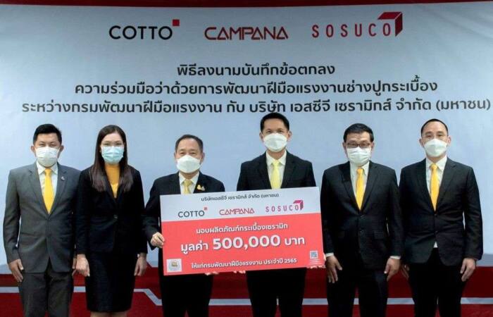 นายนำพล มลิชัย กรรมการผู้จัดการ บริษัทเอสซีจี เซรามิกส์ จำกัด (มหาชน) ผู้ผลิตและจำหน่ายกระเบื้องชั้นนำของไทยภายใต้แบรนด์ “คอตโต้” (COTTO) โสสุโก้ (SOSUCO) และ คัมพานา (CAMPANA) ร่วมกับกรมพัฒนาฝีมือแรงงาน (กพร.) กระทรวงแรงงาน โดยนายประทีป ทรงลำยอง อธิบดีกรมพัฒนาฝีมือแรงงาน ได้ร่วมกันลงนามบันทึกข้อตกลงนามความร่วมมือว่าด้วยการพัฒนาฝีมือแรงงานช่างปูกระเบื้อง พร้อมทั้งปลูกจิตสำนึกต่อสิ่งแวดล้อม (Green Job) ซึ่งความร่วมมือครั้งนี้เป็นการต่อยอดความสำเร็จที่ผ่านมา โดยมีเป้าหมายยกระดับกลไกการทำงานร่วมกันเพื่อสนับสนุนการพัฒนาศักยภาพของ ฝีมือแรงงานไทย สาขาปูกระเบื้องให้มีทักษะและความรู้ความชำนาญในการปูกระเบื้อง ได้อย่างถูกต้อง ได้มาตรฐาน สอดคล้องกับการเปลี่ยนแปลงของเทคโนโลยีและความต้องการของตลาดแรงงาน เพื่อรองรับต่อการขยายตัวของระบบเศรษฐกิจในอนาคตหลังโควิดเอฟเฟคโดยการจัดฝึกอบรมหลักสูตรช่างปูกระเบื้องให้แก่ช่างก่อสร้างในพื้นที่ 20 จังหวัด ณ ห้องประชุมปกรณ์ อังศุสิงห์ ชั้น 10 อาคารกรมพัฒนาฝีมือแรงงาน กระทรวงแรงงาน