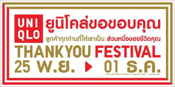 พลาดไม่ได้กับ THANK YOU FESTIVAL เทศกาลขอบคุณส่งท้ายปีจากยูนิโคล่ ตั้งแต่วันที่ 25 พฤศจิกายน – 1ธันวาคม 2565 เท่านั้น ที่ร้านยูนิโคล่ทุกสาขาและยูนิโคล่ ออนไลน์สโตร์ที่ www.uniqlo.com/th