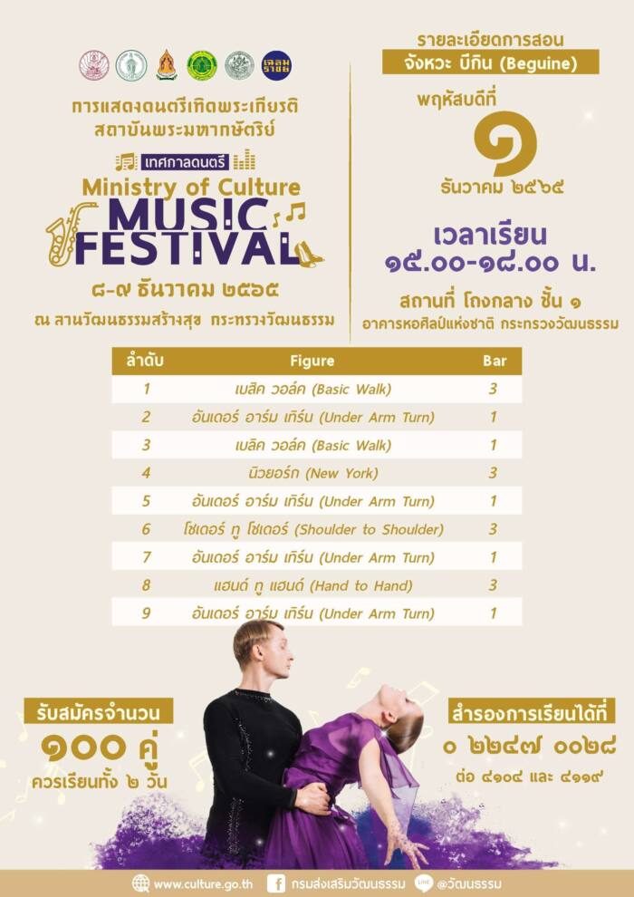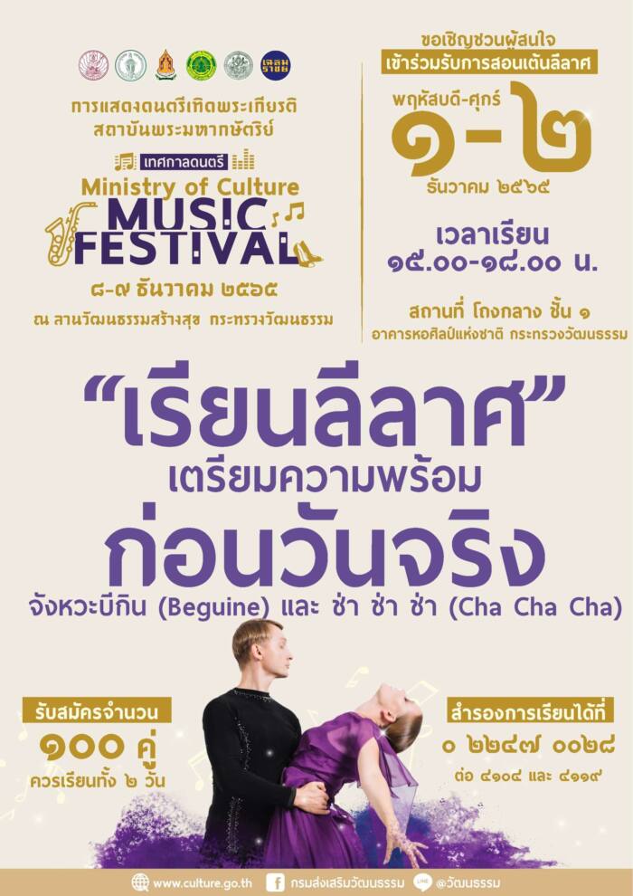 กระทรวงวัฒนธรรม โดยกรมส่งเสริมวัฒนธรรม (สวธ.) ร่วมกับกรมศิลปากร กรุงเทพมหานคร วงเฉลิมราชย์ และมูลนิธิสุนทราภรณ์ฯ จัดการแสดงดนตรีเทิดพระเกียรติสถาบันพระมหากษัตริย์ เทศกาลดนตรี Ministry of Culture Music Festival (MOC MU FES) การแสดง “Winter Love Songs : บทเพลงพระราชนิพนธ์” และการแสดง “ลีลาศสร้างสุขกับสุนทราภรณ์” ชวนประชนชาวไทยร่วมเทิดพระเกียรติและน้อมรำลึกในพระมหากรุณาธิคุณ พระบาทสมเด็จพระบรมชนกาธิเบศร มหาภูมิพลอดุลยเดชมหาราช บรมนาถบพิตร สุขใจกับบทเพลงขององค์ “อัครศิลปิน” ดื่มด่ำกับเพลงสากลยอดนิยม สนุกสนานร่วมเต้นลีลาศกับการแสดงดนตรีโดยวงสุนทราภรณ์ ระหว่างวันที่ 8 – 9 ธันวาคม 2565 ณ ลานวัฒนธรรมสร้างสุข กระทรวงวัฒนธรรม ร่วมงานฟรีไม่มีค่าใช้จ่าย