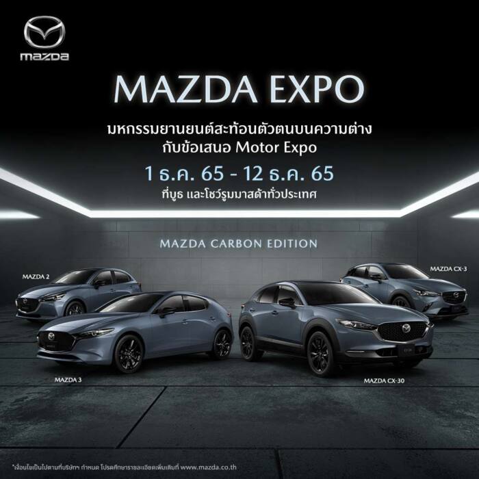 มร. ทาดาชิ มิอุระ ประธานบริหาร พร้อมด้วยคณะผู้บริหารจาก มาสด้า เซลส์ ประเทศไทย ให้การต้อนรับ นายขวัญชัย ปภัสร์พงษ์ ประธาน บริษัท สื่อสากล จำกัด และประธานจัดงาน มอเตอร์ เอ็กซ์โป 2022 พร้อมด้วยคณะผู้จัดงานฯ และคณะสื่อมวลชนกิตติมศักดิ์ ที่ให้เกียรติเข้าร่วมพิธีเปิดบูธแสดงรถยนต์มาสด้า โดยครั้งนี้ มาสด้าได้นำรถยนต์รุ่นพิเศษ Mazda CX-30 Carbon Edition สีเทา แมชชีน เกรย์ มาจัดแสดงเป็นไฮไลท์ให้แฟนๆ ได้ยลโฉมเป็นครั้งแรก พร้อมรถยนต์มาสด้ารุ่นพิเศษ Carbon Edition ในรุ่น Mazda2, Mazda3 และ Mazda CX-3 ทั้งสีเทา โพลีเมทัล เกรย์ และสีเทา แมชชีน เกรย์ รวมถึงทัพรถยนต์มาสด้าทุกรุ่นภายใต้เทคโนโลยีสกายแอคทีฟและการออกแบบอันสง่างามจาก โคโดะ ดีไซน์ มาจัดแสดงในงานฯ ซึ่งจัดขึ้นระหว่างวันที่ 1-12 ธันวาคม 2565 ณ อาคารชาเลนเจอร์ อิมแพ็ค เมืองทองธานี หรือเพียง 12 วัน เท่านั้น