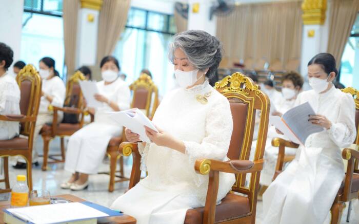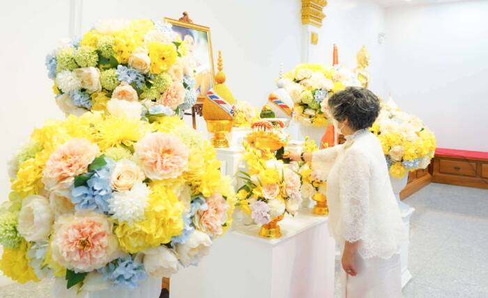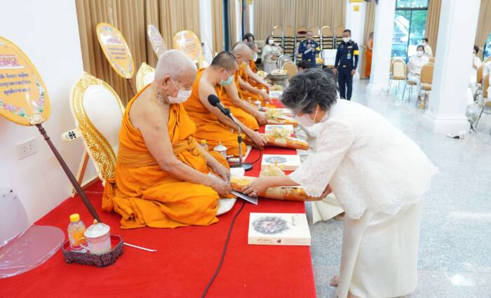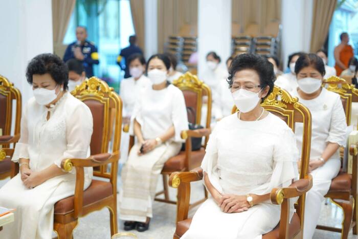จากนั้น นางสาวสุกัญญา ประจวบเหมาะ ประธานสภาสมาคมสตรีแห่งชาติฯ พร้อมด้วยคณะกรรมการอำนวยการ คณะกรรมการบริหาร สมาชิกสมทบ และคณะกรรมการฝ่าย ถวายผ้าไตร และสังฆทานพระสงฆ์ จำนวน 5 รูป พระสงฆ์สวดอนุโมทนา กรวดน้ำรับพร กราบลาพระรัตนตรัย และถวายความเคารพหน้าพระรูปสมเด็จพระเจ้าลูกเธอ เจ้าฟ้าพัชรกิติยาภา นเรนทิราเทพยวดี กรมหลวงราชสาริณีสิริพัชร มหาวัชรราชธิดา