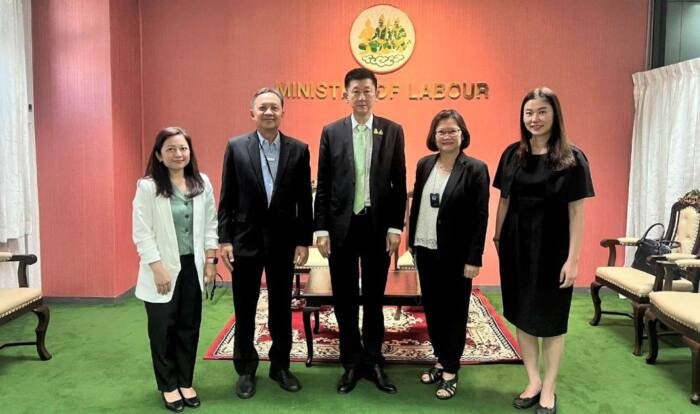 บริษัท สยามแม็คโคร จำกัด (มหาชน) โดย นางสุดารัตน์ ชมอินทร์ ผู้อำนวยการ ฝ่ายบริหารทรัพยากรบุคคลต่างประเทศ (ที่ 2 จากขวา), นางชลพินทุ์ เจริญพัฒนาสถิตย์ ผู้อำนวยการอาวุโส ฝ่ายบริหารทรัพยากรบุคคล ธุรกิจค้าส่งแม็คโครประเทศไทย (ที่ 1 จากขวา), นางสาวจารุเนตร คำวงศ์ษา ผู้จัดการอาวุโส ฝ่ายบริหารทรัพยากรบุคคล (ที่ 1 จากซ้าย) พร้อมด้วย นายปริโสทัต ปุณณภุม รองกรรมการผู้จัดการอาวุโสสายงานทรัพยากรบุคคล บริษัท Perfect companion group ในเครือเจริญโภคภัณฑ์ (ที่ 2 จากซ้าย) เข้าพบ ปลัดกระทรวงแรงงาน นายบุญชอบ สุทธมนัสวงษ์ (ที่ 3 จากซ้าย) ณ กระทรวงแรงงาน เพื่อหารือด้านการจ้างแรงงานและการพัฒนาทักษะฝีมือแรงงานให้ตรงกับความต้องการ สอดคล้องกับนโยบายด้านบุคลากรของแม็คโคร ที่มุ่งเน้นให้เกิดการจ้างแรงงานท้องถิ่นในทุกสาขาที่แม็คโครตั้งอยู่ ทั้งในประเทศไทยและต่างประเทศ พร้อมกับการพัฒนาและส่งเสริมให้พนักงาน “Reskill” และ “Upskill” อย่างต่อเนื่อง เพื่อต่อยอดการทำงาน สร้างการเติบโตในสายอาชีพธุรกิจค้าส่งค้าปลีก