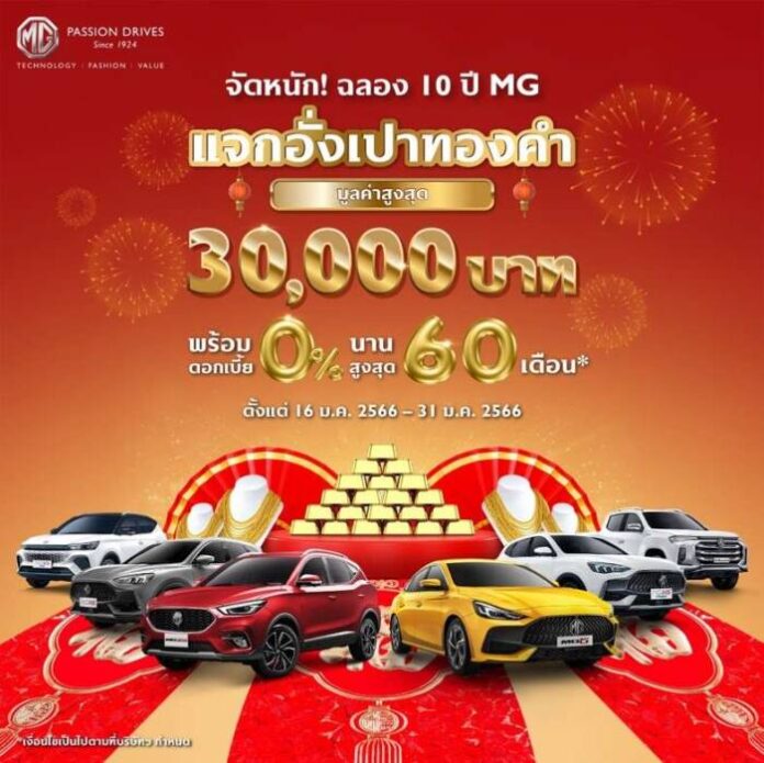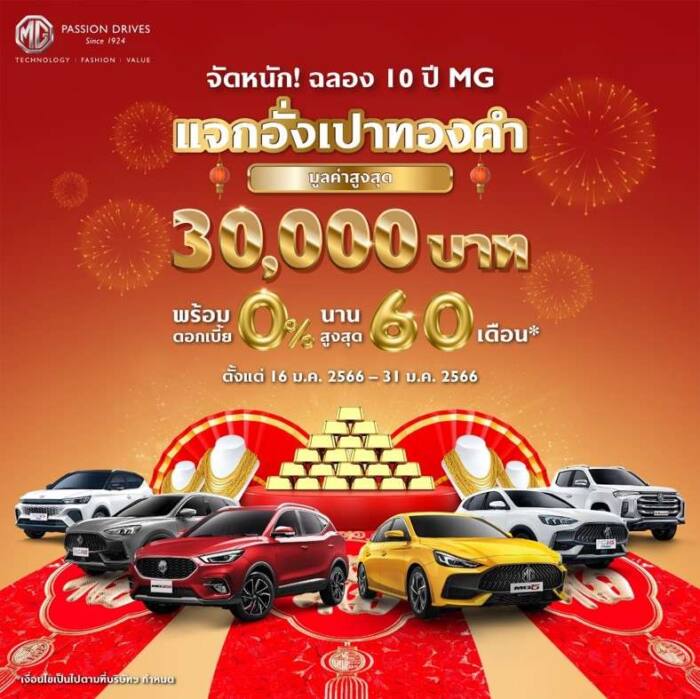 บริษัท เอสเอไอซี มอเตอร์ – ซีพี จำกัด และ บริษัท เอ็มจี เซลส์ (ประเทศไทย) จำกัด ผู้ผลิตและผู้จำหน่ายรถยนต์เอ็มจีในประเทศไทย ต้อนรับปีกระต่ายทองด้วยแคมเปญยิ่งใหญ่ มอบความคุ้มค่าให้ลูกค้าใหม่ ด้วยแคมเปญออกรถรับทองคำ!! มูลค่าสูงสุด 30,000 บาท พร้อมรับดอกเบี้ยต่ำสุด 0% นาน 60 เดือน ตั้งแต่วันนี้ ถึง 31 มกราคม 2566 โดยมีรายละเอียดแคมเปญของแต่ละรุ่น ดังนี้