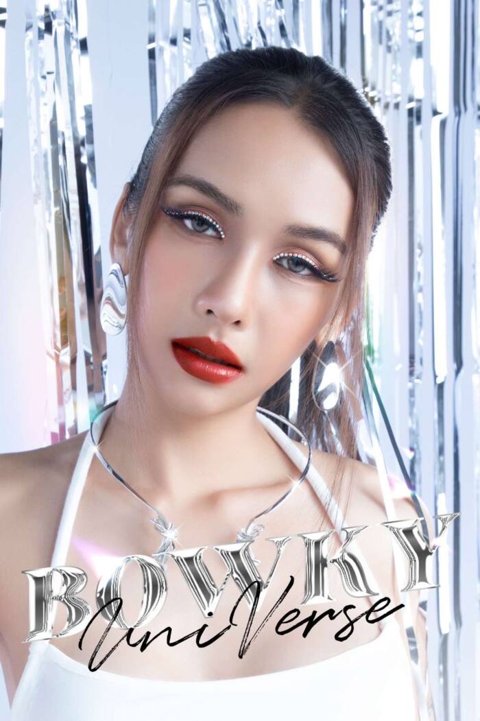 เมคอัพลุคนี้ นอกจากผิวที่เป๊ะสุดๆแล้ว จะเน้นลูกเล่นไปที่เปลือกตา โดยเอาเพชรเม็ดเล็กมาติดตามเส้นของอายไลนเนอร์สีส้ม จาก Eye shadow รุ่น Cheers Around Trio Eye Palette เบอร์04 ที่เป็นสีแมทท์มา Adapt ทำเป็นเส้นไลเนอร์ นอกจากนี้ยังสามารถนำสีชิมเมอร์ และกลิตเตอร์ในพาเลทเดียวกัน มาแต่งเปลือกตาให้ดูมิติมากขึ้น ในส่วนของลิปสติก แบรนด์เลือกนำ Hyaluron Lip Moist หรือลิปไฮยาสีเบอร์08 Be brown มาใช้ เป็นสีโทนส้มอมแดง เพิ่มความชุ่มชื้นให้แก่ริมฝีปาก ฟินิชปากจะดูฉ่ำวาวสุขภาพดี ซึ่งจะช่วยเพิ่มให้เมคอัพดูโดดเด่นมากยิ่งขึ้น เป็น Complete look ที่ดู Shine และ ทันสมัย พร้อมกับการเป็น Bowky Universe