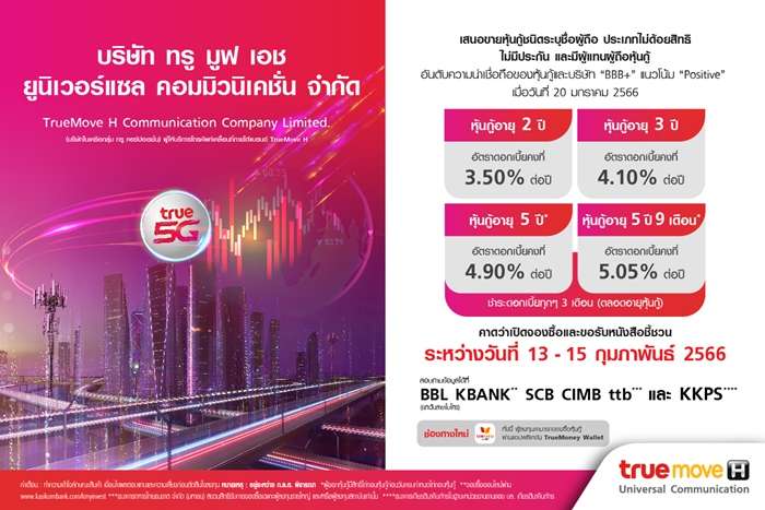 กลุ่มทรู เตรียมออกหุ้นกู้บริษัท ทรู มูฟ เอช ยูนิเวอร์แซล คอมมิวนิเคชั่น จำกัด หรือ TUC ประเภทไม่ด้อยสิทธิ ไม่มีประกัน และมีผู้แทนผู้ถือหุ้นกู้ จำนวน 4 ชุด อายุหุ้นกู้ตั้งแต่ 2 ปี ถึง 5 ปี 9 เดือน อัตราดอกเบี้ยคงที่ระหว่าง 3.50-5.05% ต่อปี เสนอขายแก่ผู้ลงทุนทั่วไป (Public Offering) และผู้ลงทุนสถาบัน อันดับความน่าเชื่อถือของหุ้นกู้และบริษัทฯ อยู่ที่ระดับ “BBB+” แนวโน้มอันดับเครดิต “บวก” จากบริษัท ทริสเรทติ้ง จำกัด เมื่อวันที่ 20 มกราคม 2566 คาดว่าจะเปิดให้จองซื้อระหว่างวันที่ 13-15 กุมภาพันธ์ 2566 ผ่านธนาคารกรุงเทพ กสิกรไทย ไทยพาณิชย์ ซีไอเอ็มบี ไทย ทหารไทยธนชาต บริษัทหลักทรัพย์เกียรตินาคินภัทร และทรูมันนี่ วอลเล็ท โดยมีธนาคารกรุงศรีอยุธยาเป็นผู้แทนผู้ถือหุ้นกู้