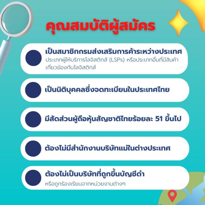 กรมส่งเสริมการค้าระหว่างประเทศ จึงขอเชิญชวนผู้ประกอบการในธุรกิจโลจิสติกส์ที่สนใจ เช่น บริการขนส่งสินค้า ขนถ่ายวัสดุ ผลิตภัณฑ์และบรรจุภัณฑ์ คลังสินค้า เทคโนโลยีและนวัตกรรมโลจิสติกส์ รวมถึง Start up