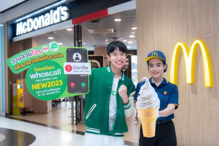 บริษัท แมคไทย จำกัด ผู้ดำเนินธุรกิจอาหารบริการด่วนภายใต้ แบรนด์แมคโดนัลด์ในประเทศไทย ร่วมกับ Whoscall แอปพลิเคชันระบุเบอร์แปลกแจ้งเตือนว่าใครโทรมา และ ป้องกันสแปม ส่งแคมเปญพิเศษสำหรับผู้ใช้ใหม่ เพียงดาวน์โหลดแอปฯ Whoscall ที่นอกจากจะรู้ทันเบอร์แปลกแล้วยังได้รับไอศกรีมแมคโดนัลด์ไปทานฟรี ง่ายๆ แค่ดาวน์โหลดแอป Whoscall ได้ที่ https://Whoscallthailand.onelink.me/1Ffj/prGetApp หรือพิมพ์ค้นหาคำว่า Whoscall บน AppStore (iOS) หรือ PlayStore (Android) จากนั้นตั้งค่าแอปฯ Whoscall พร้อมกรอกโค้ด NEW2023 เพื่อรับ QR Code ไปแลกรับความอร่อยของไอศกรีมโคนจากแมคโดนัลด์ฟรี! จำนวน 1 โคน ต่อ 1 สิทธิ์ ต่อ 1 บัญชีผู้ใช้ Whoscall