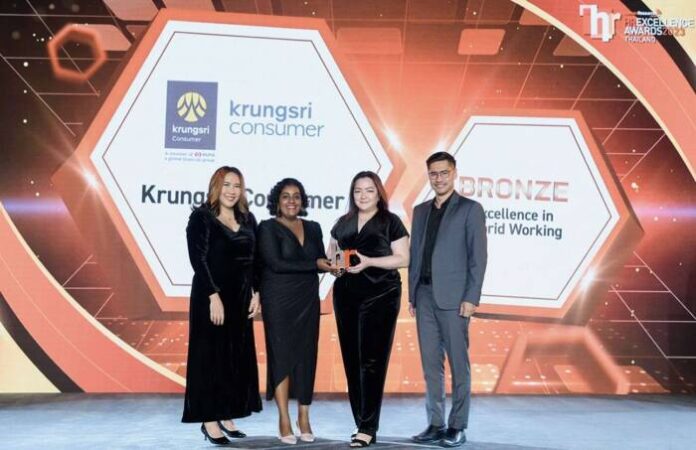 อุณา วัชโรบล (ที่ 2 จากขวา) ผู้อำนวยการอาวุโส สายงานบริหารทรัพยากรบุคคล กรุงศรี คอนซูมเมอร์ รับรางวัลยอดเยี่ยมด้านกลยุทธ์ขับเคลื่อนการทำงานแบบไฮบริด (“Bronze” Excellence in Hybrid Working) จาก HR Excellence Awards Thailand 2023 ที่จัดขึ้นโดยนิตยสาร Human Resources Online จากความสำเร็จด้านการวางนโยบายเชิงกลยุทธ์ในการขับเคลื่อนวิถีการทำงานรูปแบบใหม่ Hybrid Working/Remote Working ภายใต้แนวคิด Flexi Workplace, Flexi Work-life เพื่อสร้างความยืดหยุ่น ตอบโจทย์ไลฟ์สไตล์ และความต้องการของพนักงานที่หลากหลายในองค์กร ควบคู่กันกับการรักษามาตรฐานระบบความปลอดภัยของข้อมูลและคุณภาพการให้บริการแก่ลูกค้า