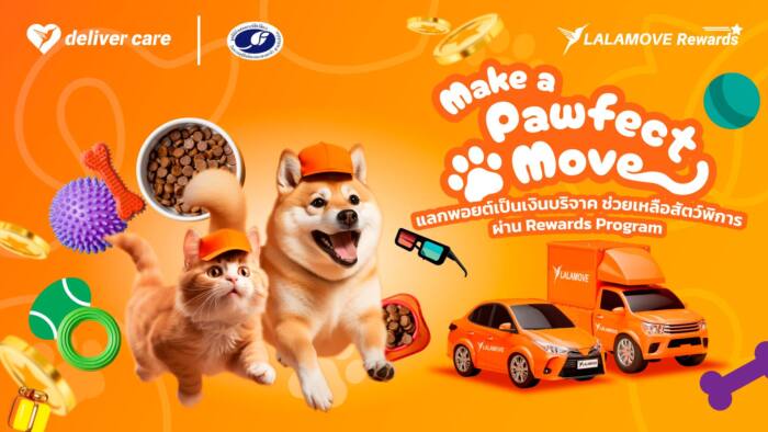 แคมเปญ “Make a Pawfect Move” เชิญชวนให้ผู้ใช้งานลาลามูฟที่เป็นสมาชิก Lalamove Rewards ร่วมบริจาค LalaPoints เพื่อแลกเป็นเงินบริจาคให้แก่ มูลนิธิบ้านสงเคราะห์สัตว์พิการ ในการจัดซื้ออาหาร เครื่องมือการแพทย์ และสิ่งของจำเป็น ในการรักษาและสงเคราะห์สัตว์พิการจรจัด สามารถแลก 4,000 LalaPoints เพื่อบริจาค 20 บาท หรือแลกใช้ 8,000 LalaPoints เพื่อบริจาค 40 บาท โดยสามารถร่วมบริจาคได้ที่แอปพลิเคชันลาลามูฟ ตั้งแต่วันที่ 4 ตุลาคม – 4 ธันวาคม 2566 สามารถอ่านเพิ่มเติมเกี่ยวกับแคมเปญได้ที่ https://bit.ly/46fH0na