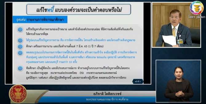 ทั้งนี้รายงานการศึกษา เรื่อง กรอบแนวทางการแก้ไขหนี้สินแบบองค์รวม ของคณะกรรมาธิการฯฉบับนี้ มีจุดเด่นในการแก้ไขปัญหาแบบองค์รวม คือเป็นการแก้ปัญหาเชิงภาพรวมของเป้าหมาย คำนึงถึงองค์ประกอบย่อยที่มีความสัมพันธ์ซึ่งกันและกันให้ครบถ้วน มีรูปแบบการแก้ไขปัญหาภาพรวม 3 ประการคือ 1.การจัดการหนี้สิน 2.โครงสร้างเชิงองค์กร และ 3.โครงสร้างเชิงกฎหมาย ซึ่งรายงานฉบับนี้เริ่มตั้งนับ 1 เมื่อวันที่ 7 มีนาคม 2565 ใช้เวลาทำงานวิจัยชิ้นนี้มาอย่างต่อเนื่องคือ 1 ปี 7 เดือน และที่น่าดีใจคือ งานวิจัยชิ้นนี้ไม่ใช่งานวิจัยเชิงวิชาการแบบลอยๆ เพราะเราเอาโมเดลที่เราค้นพบไปทดสอบประมาณ 7 จังหวัด คือ นครราชสีมา ศรีสะเกษ ขอนแก่น อุดรธานี นครศรีธรรมราช กรุงเทพ และนนทบุรีมากกว่า 10 ครั้ง เอาทีมลงไปแก้หนี้ครู แก้หนี้สหกรณ์การเกษตร และพบทางออกว่าสามารถแก้หนี้ได้จริง