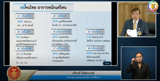 รองประธานคณะกรรมาธิการการแก้ปัญหาความยากจนฯ กล่าวว่าหนี้ครัวเรือนเป็นปัญหาที่น่าห่วง แค่ไตรมาสแรกของปีนี้ มีหนี้อยู่ 90.6 % ของ GDP คิดเป็นเงินประมาณ 15 ล้านล้านบาทงบประมาณของประเทศที่มี 3.3 ล้านล้าน เท่ากับว่าขณะนี้หนี้ครัวเรือนเป็น 5 เท่าของงบประมาณของประเทศ และมีข้อมูลพบว่าคนไทย 1 ใน 3 ของประเทศก็คือประมาณ 25 ล้านคน เป็นหนี้สูงตามข้อมูลธนาคารแห่งประเทศไทย โดย 57 % เป็นหนี้เกิน 100,000 บาท และ 14 % เป็นหนี้เกิน 1 ล้านบาท และเป็นหนี้เสีย 1 ใน 3 ของงบประมาณแต่ละปี ถือว่าเป็นหนี้ก้อนโต