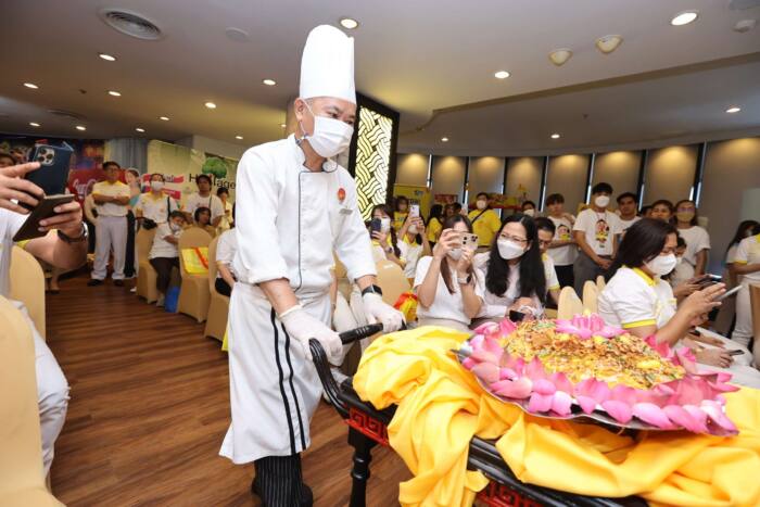 งานด้านพิธีการ คณะกรรมการได้จัดให้มีการทำอาหารเจมงคลกระทะใหญ่ “ผัดหมี่สวรรค์ ธัญพืชมงคล” โดยเชฟจาก โรงแรมแกรนด์ ไชน่า เยาวราช มาเป็นมาสเตอร์เชฟในการปรุงอาหาร พร้อมแจกฟรีให้ผู้ร่วมงาน จำนวน 1,000 จาน ในพิธีเปิดงานวันอาทิตย์ที่ 15 ตุลาคม 2566 โดยในปีนี้ คณะกรรมการได้จัดทำ “ขนมฮ๊วกก๊วย” ขนมมงคลที่ผ่านพิธีกรรมการบูชาเทพเจ้ามาแล้ว พร้อมประทับอักษรเจมงคล 4 ตัว คือ “กิ้ว อ๋อง เซ้ง อ้วย” โดย กิ้ว 九 หมายถึง เก้า 9, อ๋อง 皇 หมายถึง อ๋อง หรือกษัตริย์, เซ้ง 勝 หมายถึง ความสำเร็จ และ อ้วย 會 หมายถึง มวลมหาสมาคม ซึ่งหมายความว่า กษัตริย์หรือเทพเจ้าทั้ง 9 พระองค์ ได้ประธานความสำเร็จให้กับมวลมหาสมาคม ณ ที่แห่งนี้ และจะนำ“ขนมฮ๊วกก๊วย” นี้ มาเป็นส่วนผสมในอาหารเจมงคลกระทะใหญ่ด้วย
