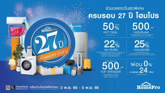และในโอกาสครบรอบ 27 ปี โฮมโปร คืนกำไรครั้งใหญ่ให้คนไทย จัดงานเฉลิมฉลองวันแห่งความพิเศษ ’27 ปี Anniversary’ มอบของขวัญแทนคำขอบคุณให้ครอบครัวคนรักบ้าน รับความคุ้มล้นมือแต่งบ้านสวยตามใจส่งท้ายปีนี้ กับสินค้า เฟอร์นิเจอร์ และของแต่งบ้านแบรนด์ดังที่ร่วมรายการ ยกขบวนลดราคาแรงส์ฉบับ HOT DEAL สูงสุดถึง 50% !! และพลาดไม่ได้กับอีกหลากหลายสิทธิประโยชน์พร้อมข้อเสนอที่ดีที่สุดจากโฮมโปรและพันธมิตรชั้นนำอีกมากมาย