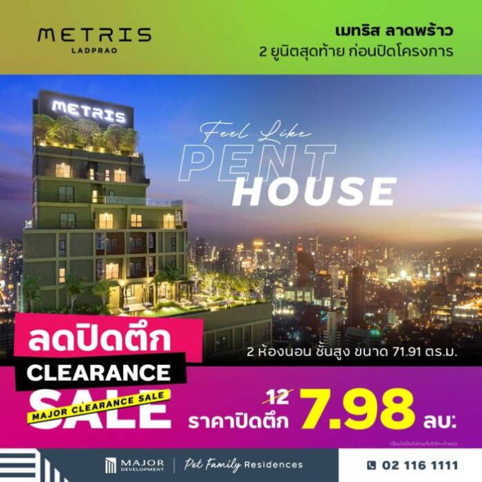 บริษัท เมเจอร์ ดีเวลลอปเม้นท์ จำกัด (มหาชน) ผู้นำด้านการพัฒนาธุรกิจอสังหาริมทรัพย์ระดับลักชูรีและคอนโดมิเนียมเลี้ยงสัตว์ได้ (Pet Family Residences) ให้คุณใช้ชีวิตดีๆ ที่เลือกได้เอง จัดโปรโมชั่นสุดเอ็กซ์คลูซีฟกระตุ้นตลาดอสังหาริมทรัพย์ ผ่านการนำเสนอห้องชุดพร้อมอยู่ กับโครงการคอนโดมิเนียมระดับลักชูรีพร้อมอยู่เลี้ยงสัตว์ได้ บนพื้นที่ศักยภาพของกรุงเทพฯ ที่เชื่อมต่อพื้นที่ CBD ของกรุงเทพฯ ได้อย่างรวดเร็ว พบกับความคุ้มค่าแบบไม่เคยมีมาก่อน มอบส่วนลดสูงสุด 5 ล้านบาท* ฟรีทุกค่าใช้จ่ายวันโอนกรรมสิทธิ์*