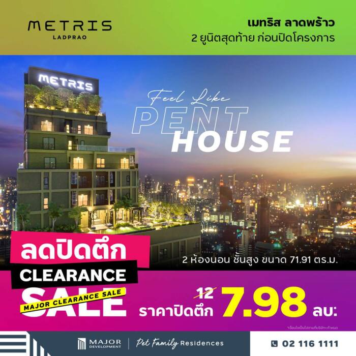 - เมทริส ลาดพร้าว คอนโดมิเนียม (METRIS Ladprao) บนทำเลที่ศักยภาพสูงสุด ใจกลางห้าแยกลาดพร้าว 250 เมตร จากMRT พหลโยธิน โดดเด่นด้วยการออกแบบภายใต้คอนเซปต์ Mid-Century ที่เน้นความคลาสสิกแบบเรียบหรู นำเสนอห้องชุดสุดหรูขนาดใหญ่ พร้อมระเบียงกว้าง ให้ความรู้สึกเหมือนอยู่PENTHOUSE บนชั้น27 ขนาดพื้นที่ 91 ตารางเมตร สนนราคาสุดเอ็กซ์คลูซีฟเพียง 7.98 ล้านบาท