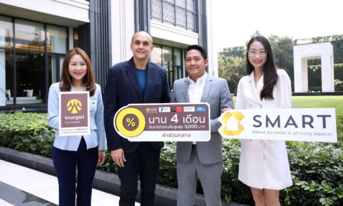 นายเกลนริชาร์ด แนกกลิส (ที่ 2 จากซ้าย) ผู้ช่วยกรรมการผู้จัดการใหญ่ ฝ่ายงานเครือข่ายการขายและฝ่ายการตลาดธุรกิจผ่อนชำระ บริษัท อยุธยา แคปปิตอล เซอร์วิสเซส จำกัด เป็นตัวแทนบัตรเครดิตและบัตรผ่อนชำระในเครือกรุงศรี คอนซูมเมอร์ ร่วมกับ นายสุวัฒน์ กุลไพจิตร (ที่ 2 จากขวา) กรรมการผู้จัดการ บริษัท สมาร์ท เซอร์วิส แอนด์ แมเนจเม้นท์ จำกัด (SMART) ผู้นำด้านการบริหารจัดการงานนิติบุคคลเพื่อการอยู่อาศัย จัดดีลพิเศษกับครั้งแรกของในการผ่อนค่าส่วนกลางเพื่อลูกบ้านของ SMART ตั้งแต่ 5 ธันวาคม 2566 – 30 เมษายน 2567 เมื่อชำระค่าส่วนกลางผ่านบัตรเครดิต กรุงศรี, บัตรกรุงศรีเฟิร์สช้อยส์, บัตรเครดิตเซ็นทรัล เดอะวัน และบัตรเครดิตโลตัส รับสิทธิ์ผ่อน 0% นานสูงสุด 4 เดือน หรือเลือกผ่อนยาวได้นานสูงสุด 10 เดือน ในอัตราดอกเบี้ยเพียง 0.74% พร้อมรับเครดิตเงินคืนสูงสุด 3,000 บาท/หมายเลขบัญชีบัตร ตลอดรายการ (เงื่อนไขเป็นไปตามที่บริษัทกำหนด) ข้อมูลเพิ่มเติม https://bit.ly/PR-SmartNiti