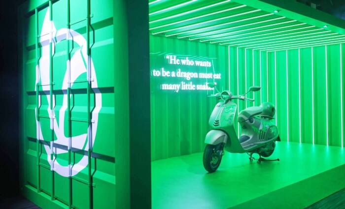 สีเขียวมรกตเฉดเดียวกับลายมังกรบน Vespa 946 Dragon ถูกใช้เป็นธีมสีหลักของปาร์ตี้ เริ่มจากอุโมงค์นีออนบริเวณทางเข้าที่ได้รับการออกแบบประหนึ่งประตูมิติที่พาแขกทุกท่านเข้าสู่โลกของ Vespa โดยเมื่อผ่านเข้ามาจะพบพระเอกของงานอย่าง Vespa 946 Dragon อวดโฉมอยู่ในตู้คอนเทนเนอร์สีเขียว ที่ตัดด้วยไฟนีออนสุดเท่ ตามด้วยไลฟ์ดีเจสุดชิคจาก DJ Xiaolin ผู้ทำหน้าที่คัดสรรบีทสนุก ๆ เติมเต็มช่วงเวลาอันแสนพิเศษตลอดค่ำคืน