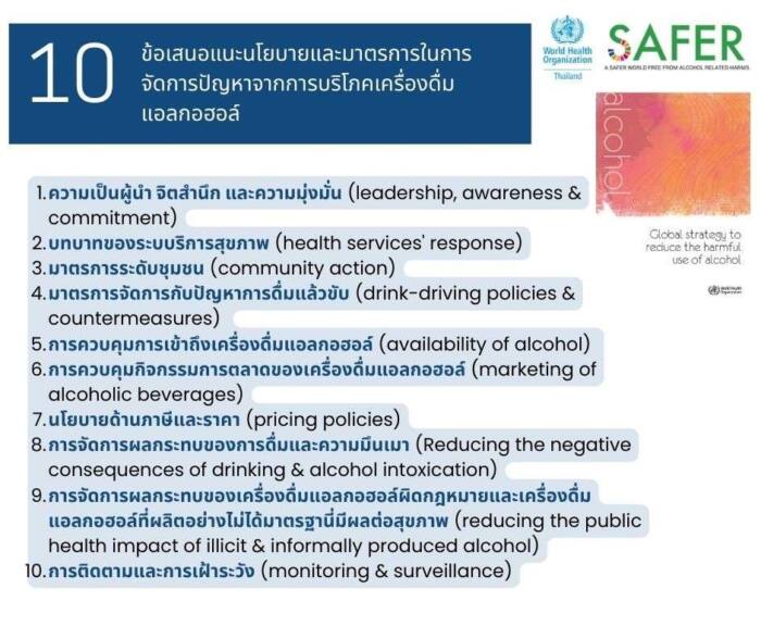 นพ.จอส ฟอนเดลาร์ ผู้แทนองค์การอนามัยโลกประจำประเทศไทย กล่าวว่า ยุทธศาสตร์โลกในการจัดการปัญหาจากบริโภคเครื่องดื่มแอลกอฮอล์ขององค์การอนามัย (WHO Global Strategy to reduce Harmful Use of Alcohol) แนะนำ 10 ข้อเสนอแนะที่ได้ผล โดยเฉพาะมาตรการที่ได้ผลสูงในการลดการบริโภคและผลกระทบในประชากร ได้แก่ 1.ควบคุมการเข้าถึงเครื่องดื่มแอลกอฮอล์ 2.ควบคุมกิจกรรมการตลาดของเครื่องดื่มแอลกอฮอล์ 3.นโยบายด้านภาษีและราคา ซึ่งประเทศต่าง ๆ ต้องดำเนินทุกมาตรการไปพร้อมกันทุกมิติ จึงจะมีประสิทธิภาพมากที่สุด ทั้งนี้ จากผลงานวิจัยศึกษาระยะยาว 21 ชิ้นจากทั่วโลก ยืนยันว่า การได้รับสื่อโฆษณาเครื่องดื่มแอลกอฮอล์มีความสัมพันธ์กับการเริ่มต้นดื่มของเด็กและเยาวชน และการดื่มหนักมากขึ้นในกรณีเป็นนักดื่มอยู่แล้ว