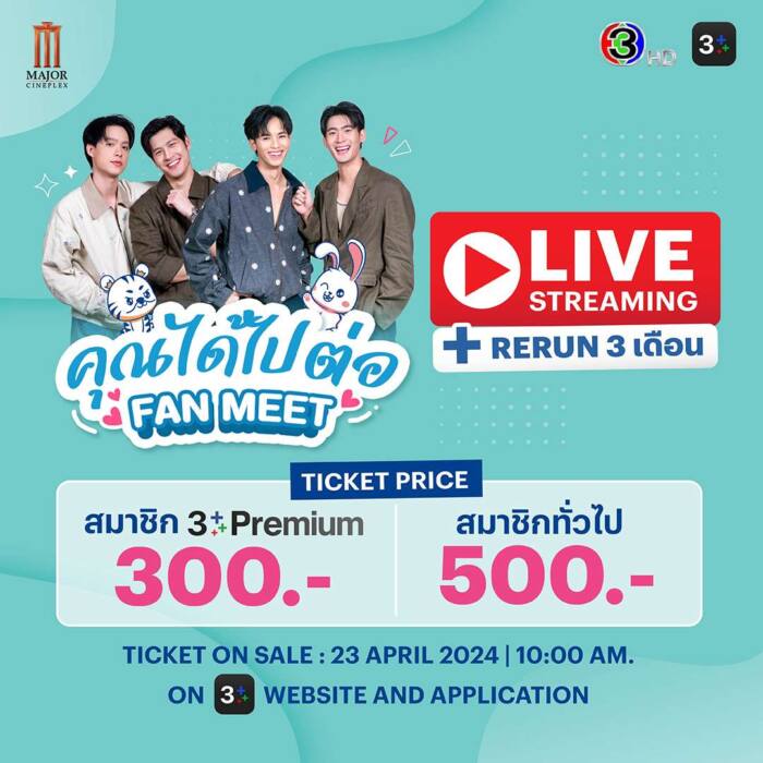 ใครที่มีบัตรกำไว้ให้แน่น ๆ เตรียมไปดูโชว์เด็ด ๆ ของทั้ง 4 หนุ่มได้ในงาน “คุณได้ไปต่อ FAN MEET” วันอาทิตย์ที่ 28 เมษายน 2567 เวลา 16.30 น. สำหรับใครที่ไม่มีบัตรสามารถกดซื้อบัตรเข้าชม “คุณได้ไปต่อ FANMEET LIVE STREAMING TICKET” ได้ในราคา 300 บาท (สำหรับสมาชิก 3Plus Premium) และราคา 500 บาท (สำหรับสมาชิกทั่วไป) *บัตรทั้งสองราคา สามารถรับชม LIVE STREAMING และ ดูย้อนหลังได้ 3 เดือน