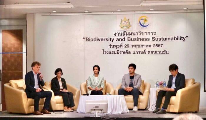 นอกจากนี้ในช่วงบ่าย ยังมีเวทีเสวนาเรื่อง “การดำเนินงานด้านความหลากหลายทางชีวภาพขององค์กรสู่การพัฒนาอย่างยั่งยืน” (Biodiversity and Business Operation Towards Sustainable Development)” โดยได้รับเกียรติจาก 1) Dr.Naoki Adachi, Director of Japan Business Initiative for Biodiversity (JBIB) – VDO presentation 2) Mr. Stefan Hörmann, Head of Business and Biodiversity, GNF 3) คุณสุธาวัลย์ จิตรธรรม ผู้ช่วยผู้อำนวยการสำนักบริหารความยั่งยืน ธรรมาภิบาลและสื่อสารองค์กร บริษัท เครือเจริญโภคภัณฑ์ จำกัด 4) คุณพินทุ์สุดา เปี่ยมปิติ ผู้จัดการส่วนกิจกรรมองค์กรและสังคม บริษัท ผลิตไฟฟ้า จำกัด (มหาชน) 5) คุณอานุภาพ คำทอง ผู้เชี่ยวชาญด้านการพัฒนาอย่างยั่งยืน บริษัท สิงห์ เอสเตท จำกัด (มหาชน) และดำเนินการเสวนาโดย ดร.เพชร มโนปวิตร นักวิทยาศาสตร์ ด้านการอนุรักษ์